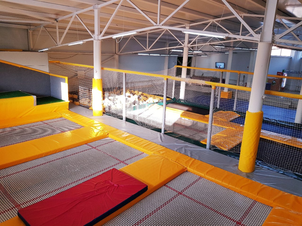 В парке 9 батутов, татами, теннисный стол, скалодром, игровая зона(обеденная).