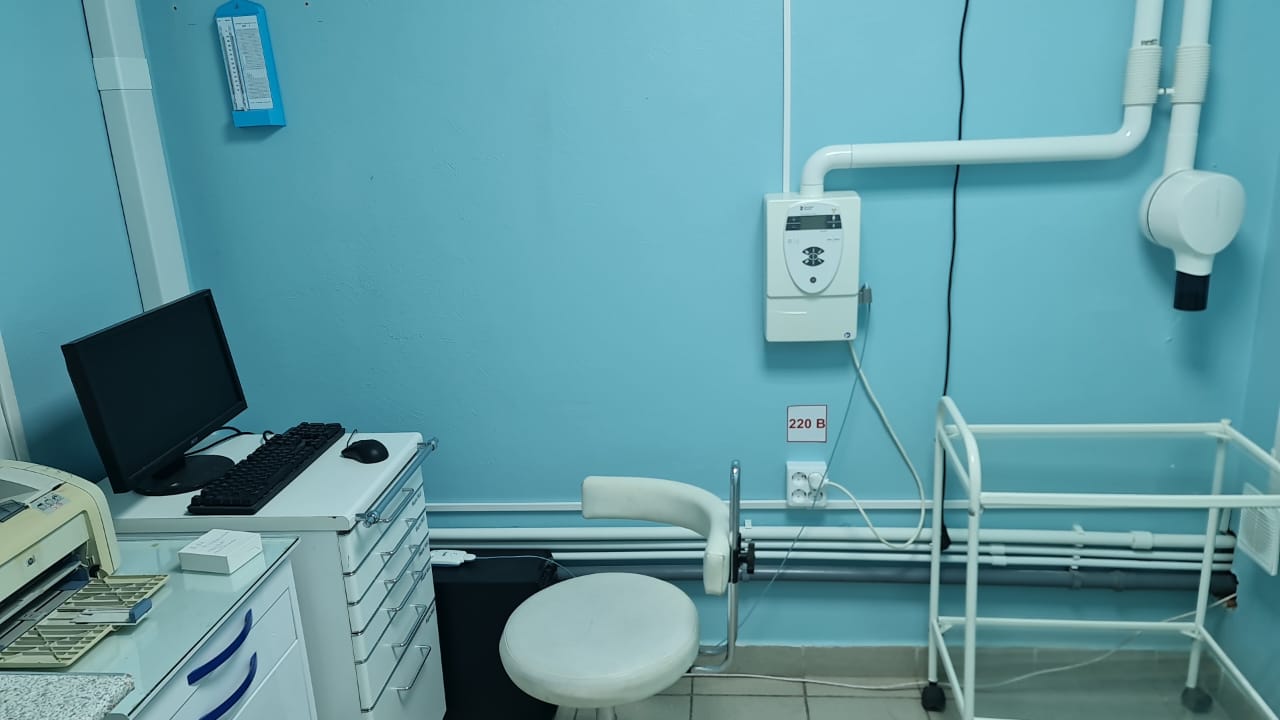 Стоматология состоит из 2 кабинетов, ординаторской, кабинета рентгена, ресепшна и сан. узела.