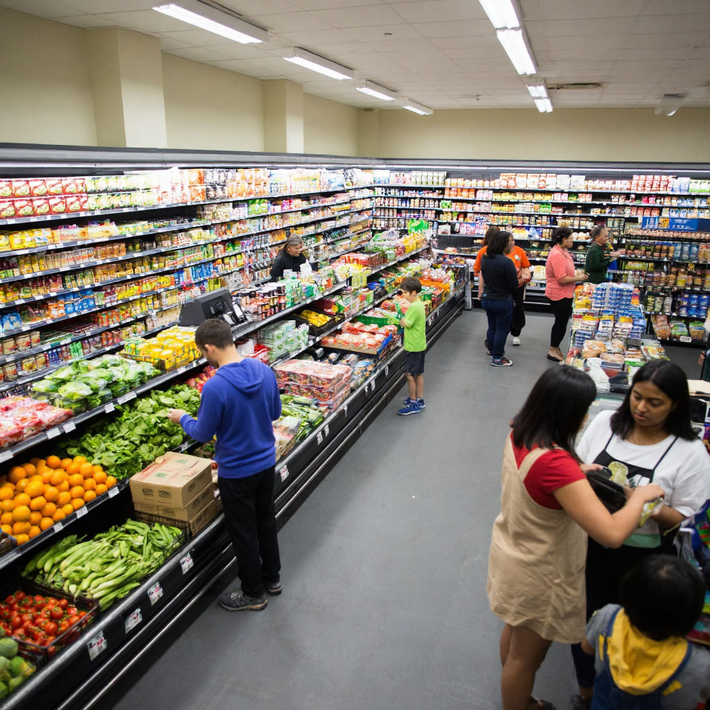 — Ассортимент: полный спектр продуктов питания (кроме алкоголя)