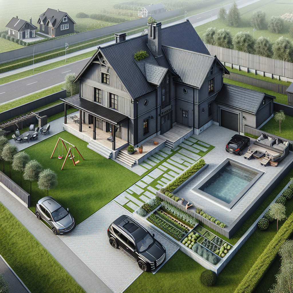 Дом представляет собой стильный барнхаус размером 110 квадратных метров, отделанный в графитовом цвете. Он построен на железобетонных сваях, а окружающая территория отделана брусчаткой «Новый город» шириной 2 метра.