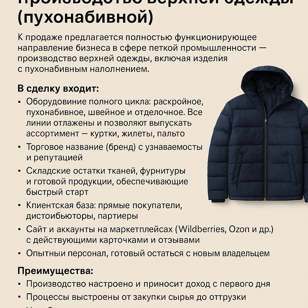 К продаже предлагается полностью функционирующее направление бизнеса в сфере лёгкой промышленности -производство верхней одежды, включая изделия с пухонабивным наполнением.