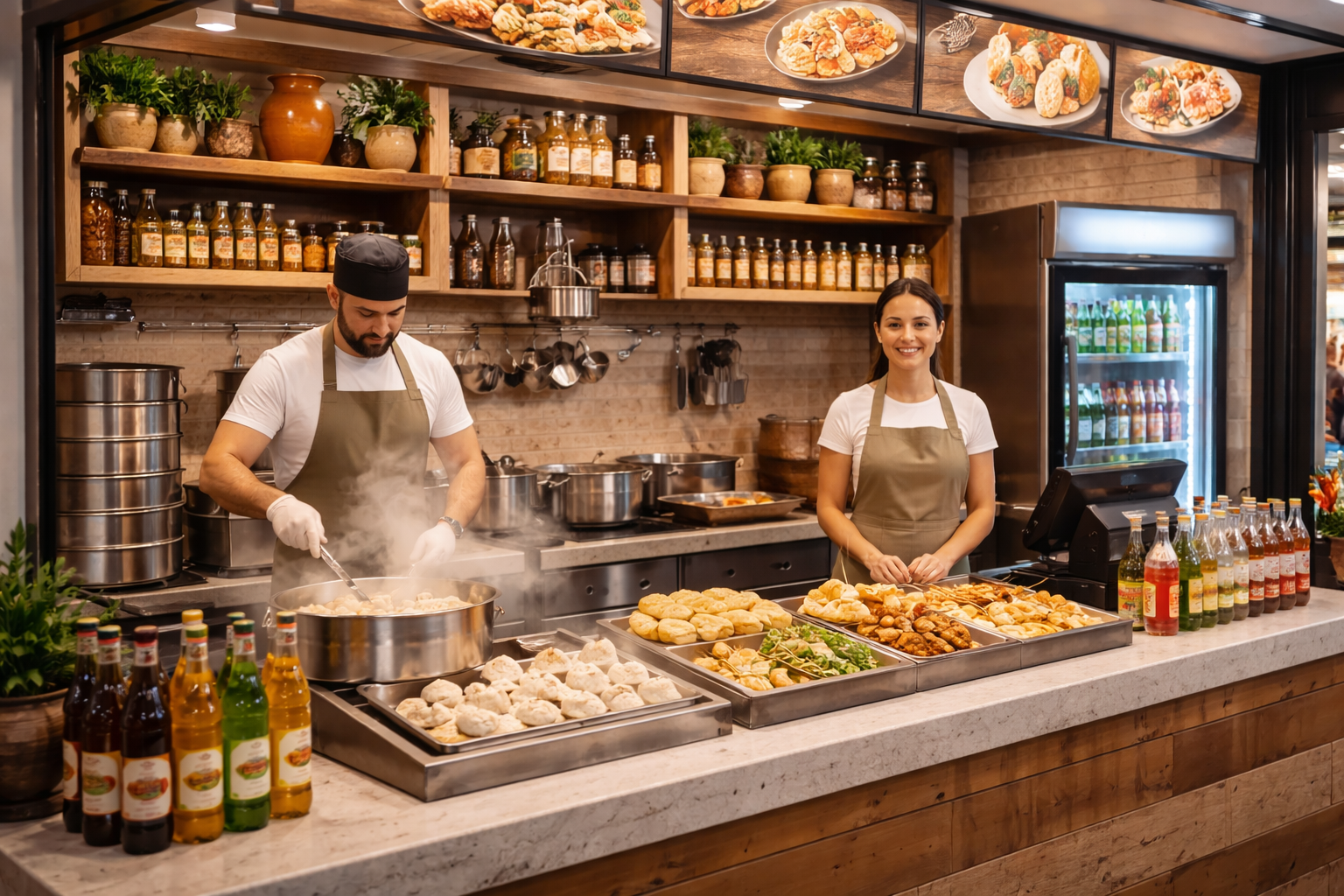 Узкая специализация — хинкали и напитки. Простое меню, понятная технология, быстрый цикл приготовления. Подходит для работы «на вынос» и доставки.