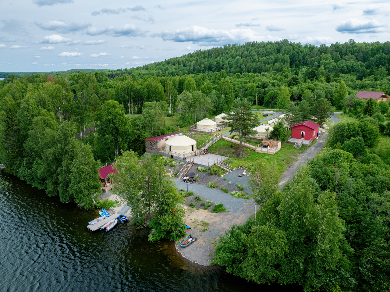 - 6 комфортабельных евроюрта площадью 40 кв.м. каждый, идеально оборудованных для комфортного проживания 4 человек (плюс 1 дополнительное место). В каждой юрте есть душ, туалет, раковина, кухонная зона, спальные места и уютная зона отдыха.