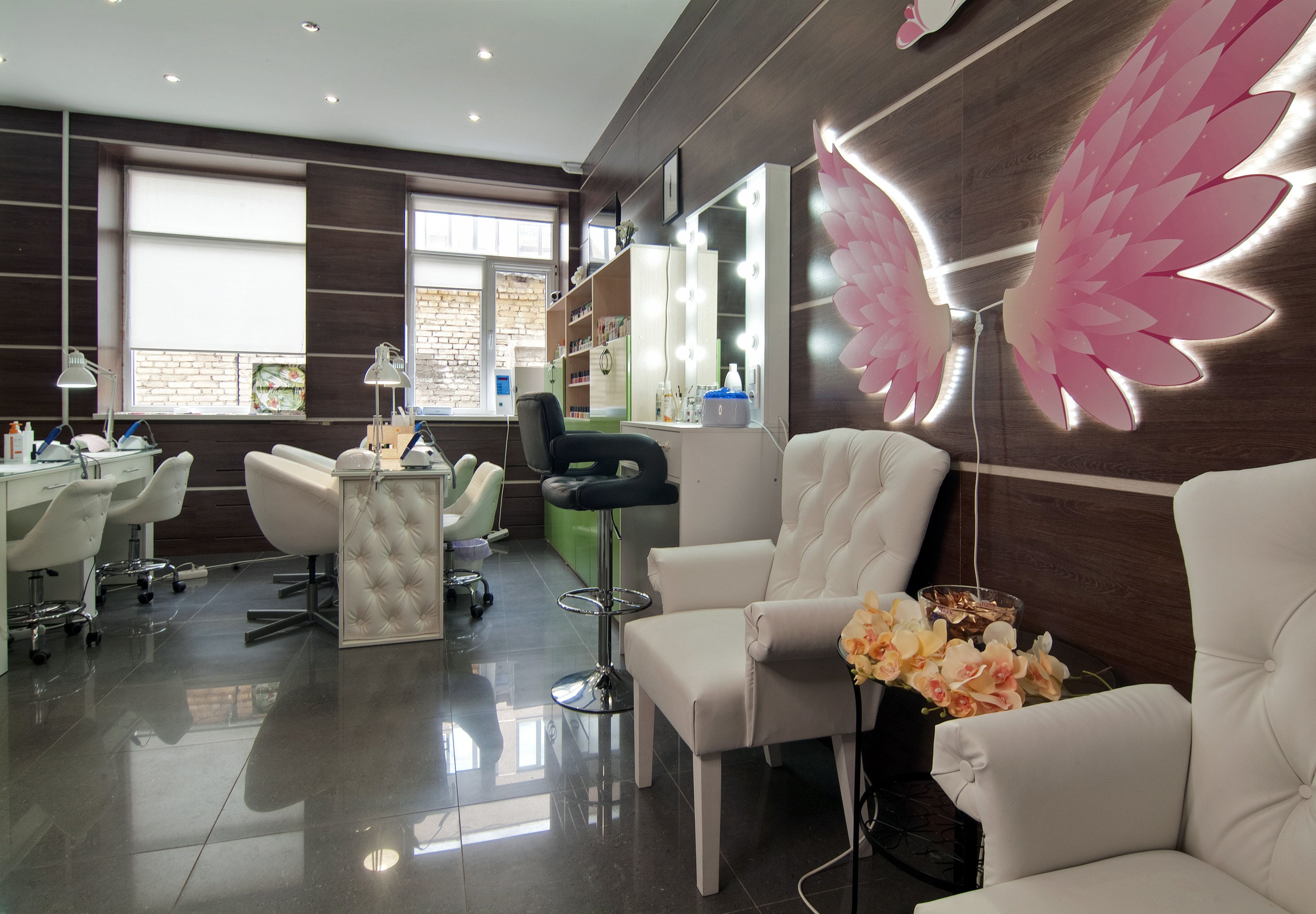 В работе задействованы 60 кв.м. Помещение поделено на гостевую зону, маникюрная часть зала рассчитана на 8 мест маникюра и 2 педикюрных места, есть комнат для шугаринга, и наращивания ресниц. В салоне приятно находится.