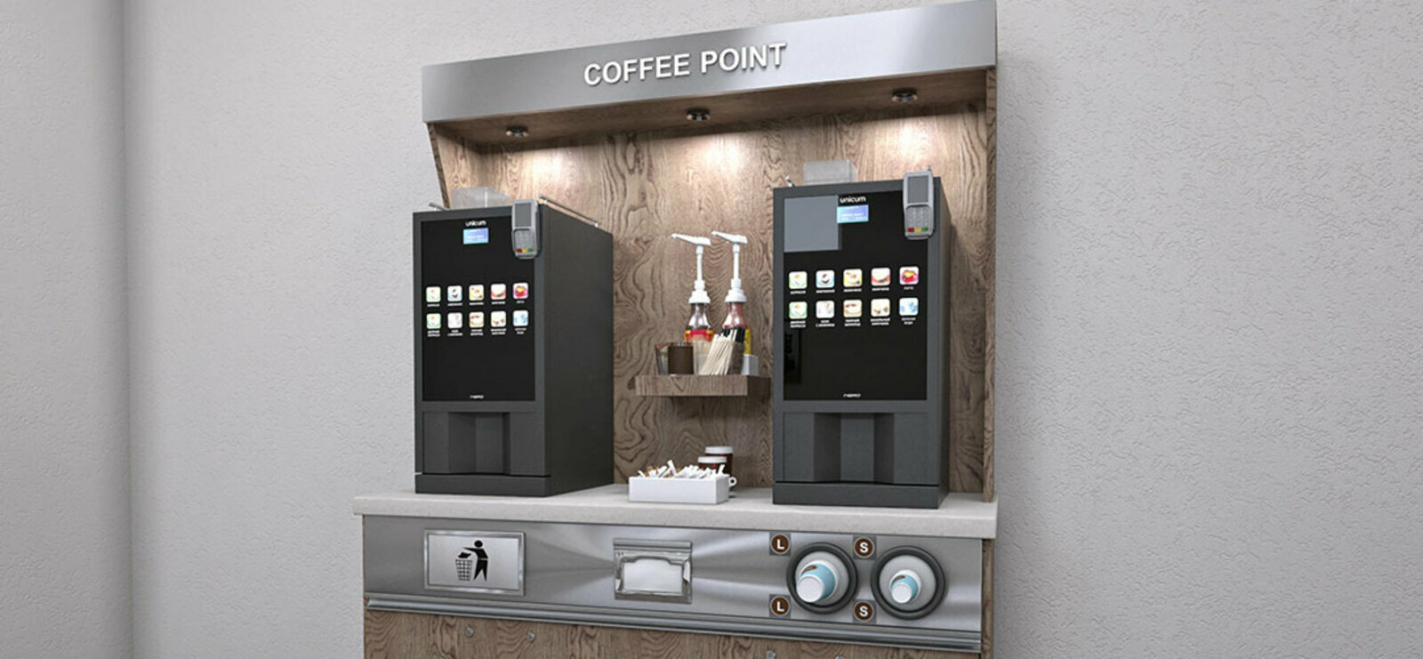 Поинты оснащены всем необходимым: модульные стойки с надежными профессиональными кофемашинами.
