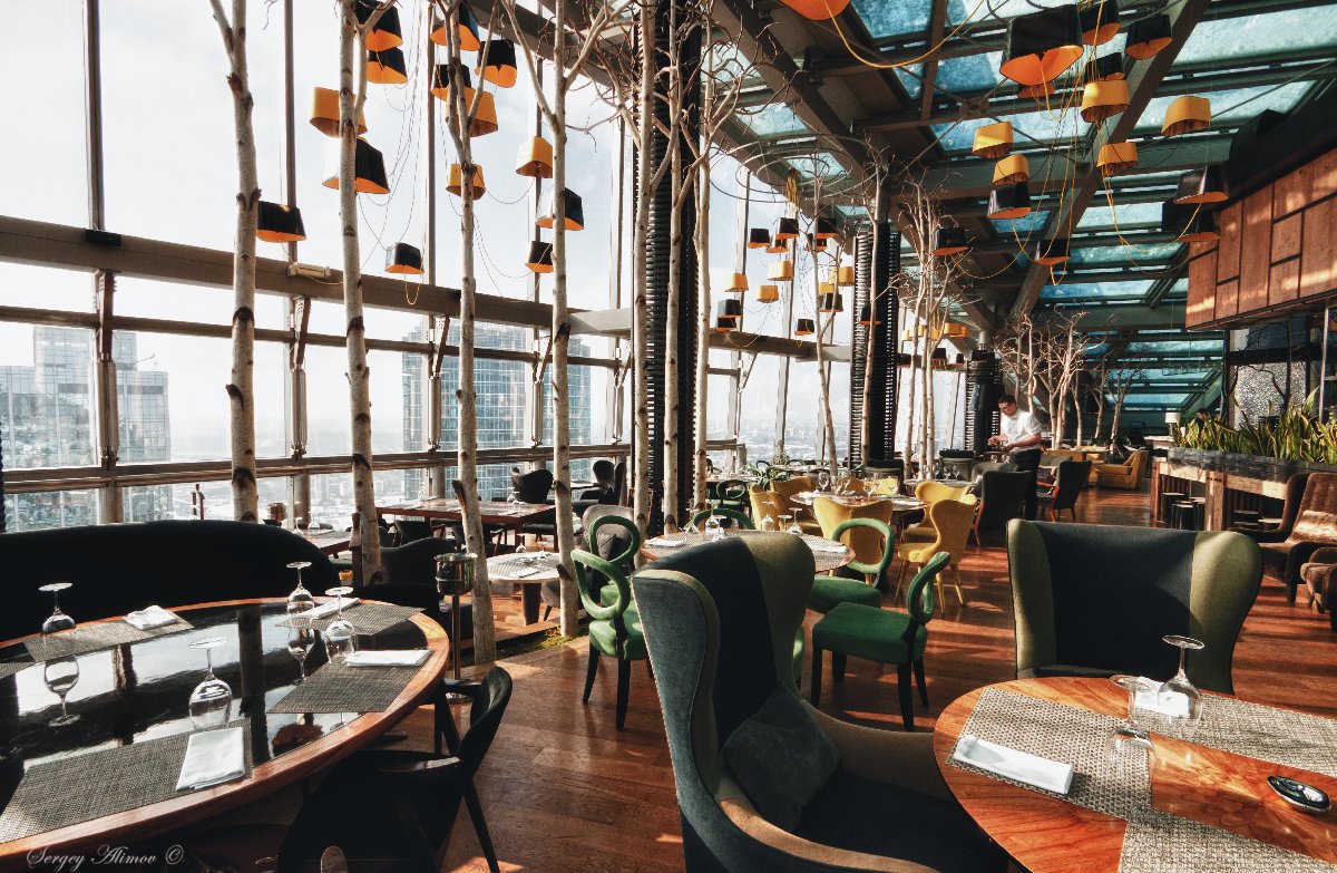 Интерьер ресторана получился стильным и уютным: панорамные окна, комфортное зонирование, мягкая мебель, удобные столы, много ярких деталей.