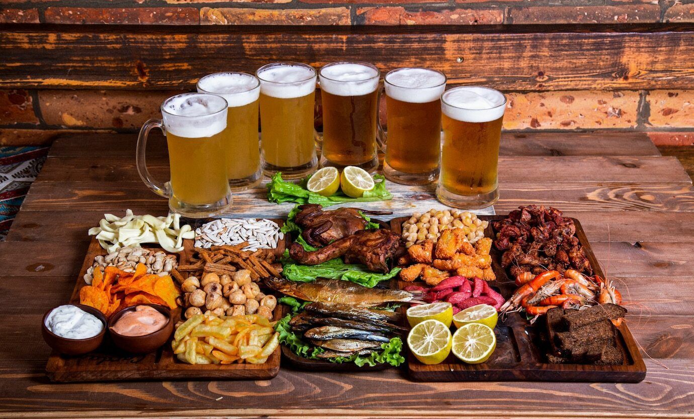 Представлен широкий ассортимент пива и закусок.