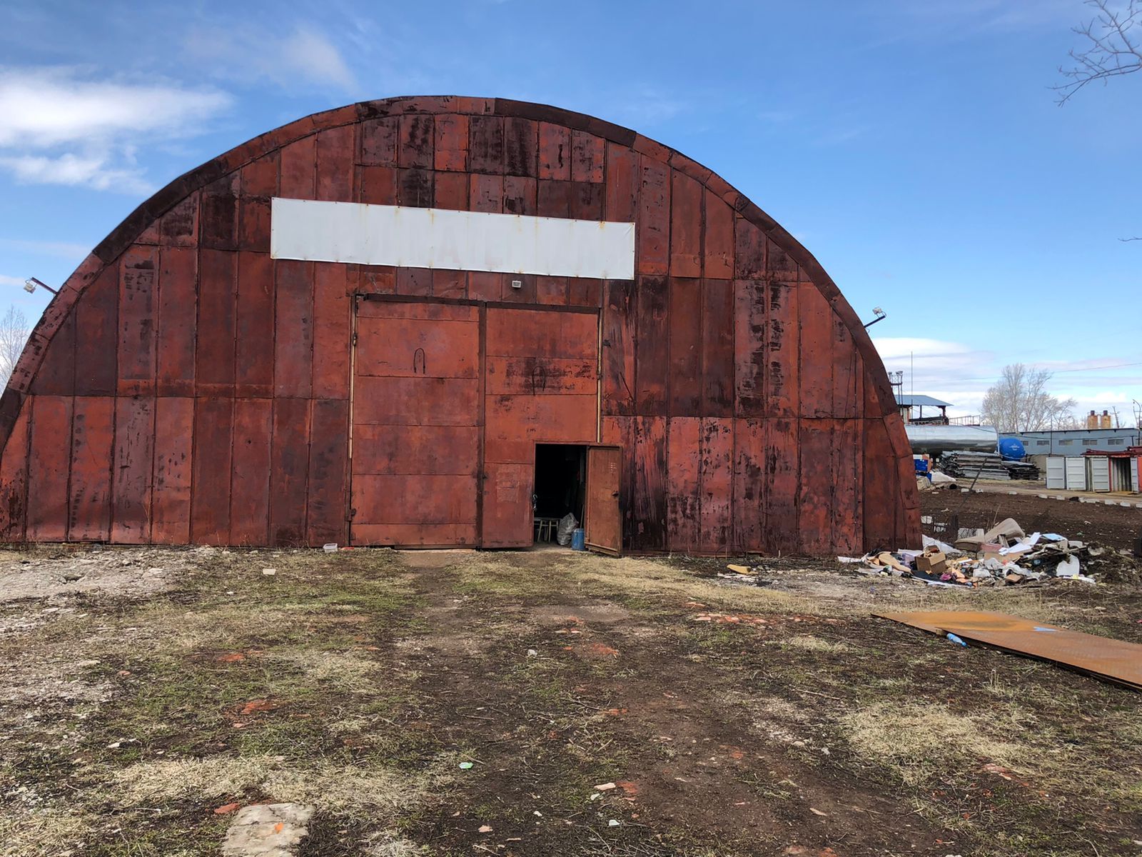На территории находится металлический ангар площадью 500м2. Полы бетонные. Внутри ангара есть помещение площадью 10 м2. Также на территории стоит металлический вагончик площадью 8 м2.